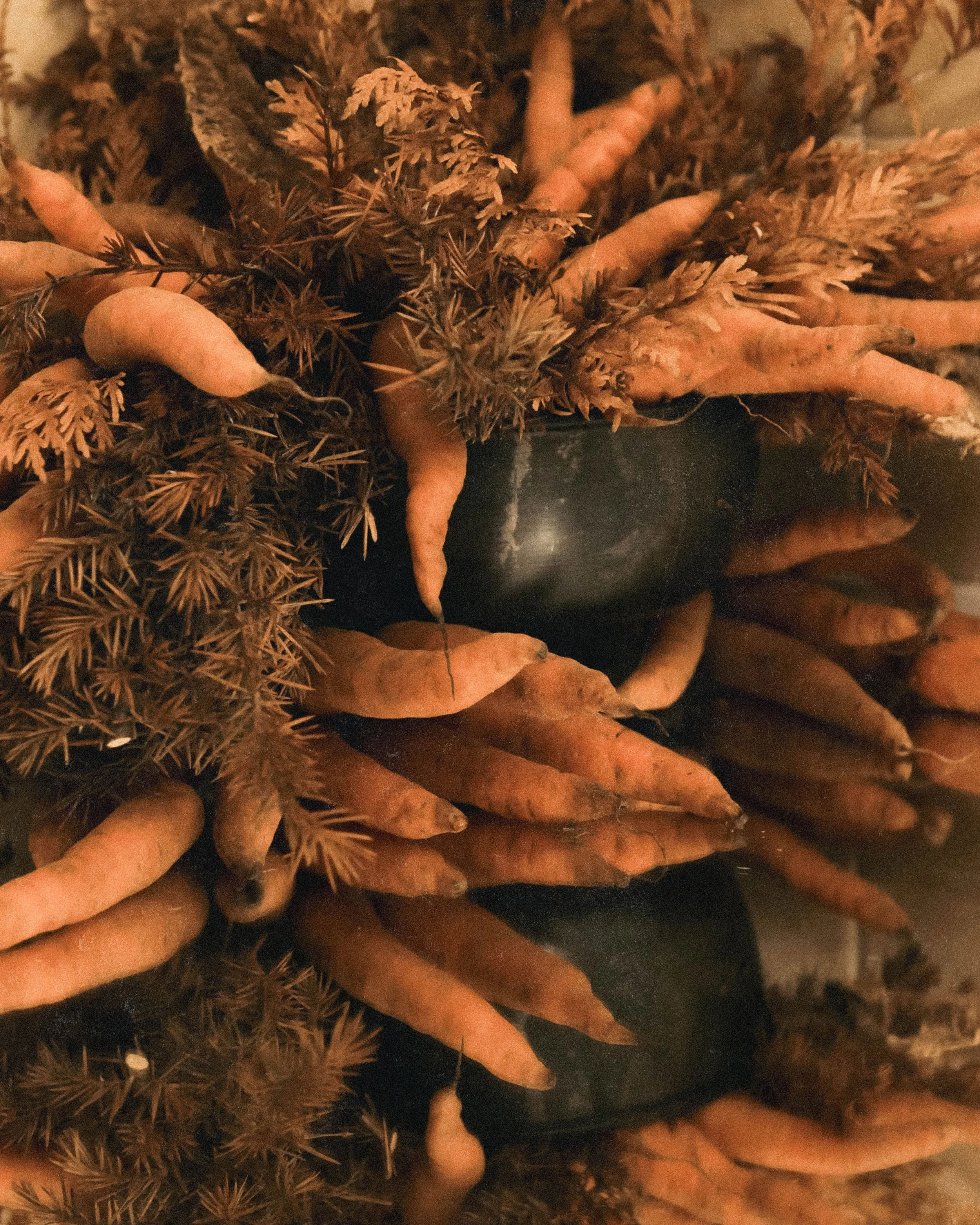Created with rotting carrots found in the compost and evergreens from the forest line that have turned to rust. Preserved shelf mushrooms rounding out this decomposing garden concept.
